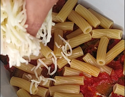 Poseu sobre la mozzarella la pasta i la salsa restant. Escampeu per sobre unes fulles d'alfàbrega i el parmesà ratllat.