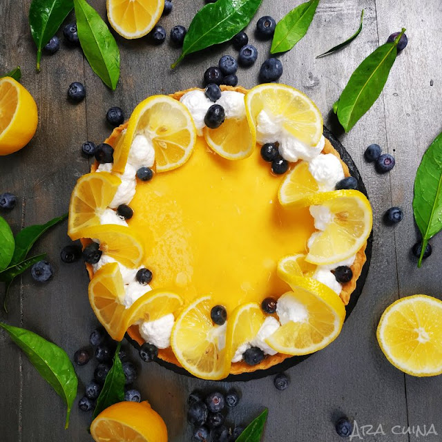 Els que em seguiu, ja sabeu que soc una fan del lemon curd. Avui el presentem amb la recepta estrella d'aquesta crema de llimona. Es tracta d'un pastís típic del Regne Unit, amb una base de galeta o massa brisa, una crema de llimona i acaba amb una merenga suïssa. És una delícia de postres, el toc àcid de la crema de llimona ajuda que no sigui molt embafador. La recepta típica recobreix tot el pastís de merenga, jo he optat per una decoració més austera, ho deixo a la vostra elecció.