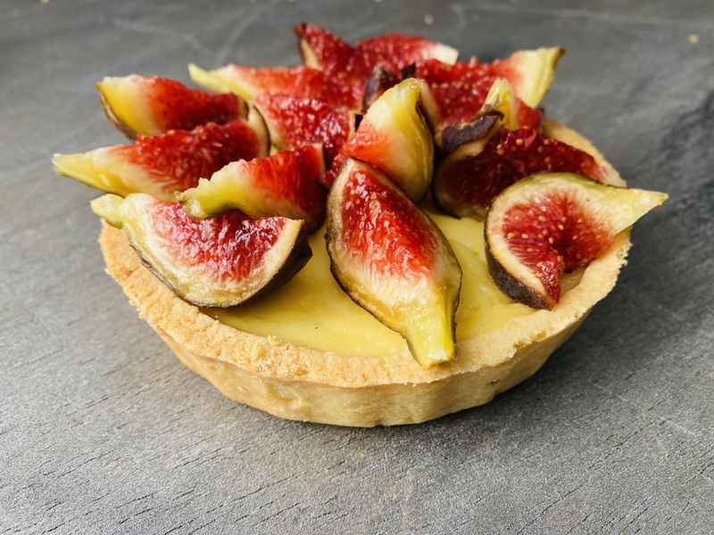 4- Posa unes cullerades de crema pastissera sobre la melmelada de figues.